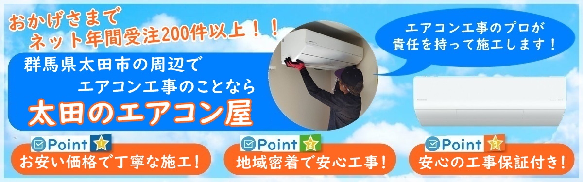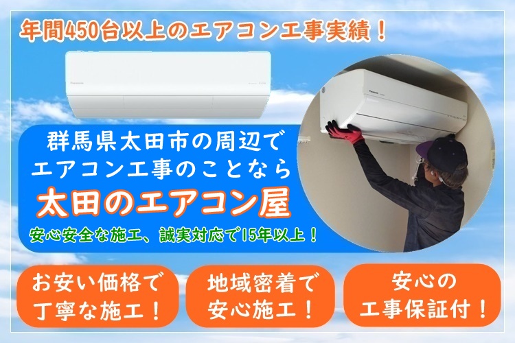 太田のエアコン屋は家庭用のエアコン工事を主にエアコン取り付け・取り外し工事をおこなっている地域密着のエアコン業者で、太田市を中心に群馬県で活動しております。